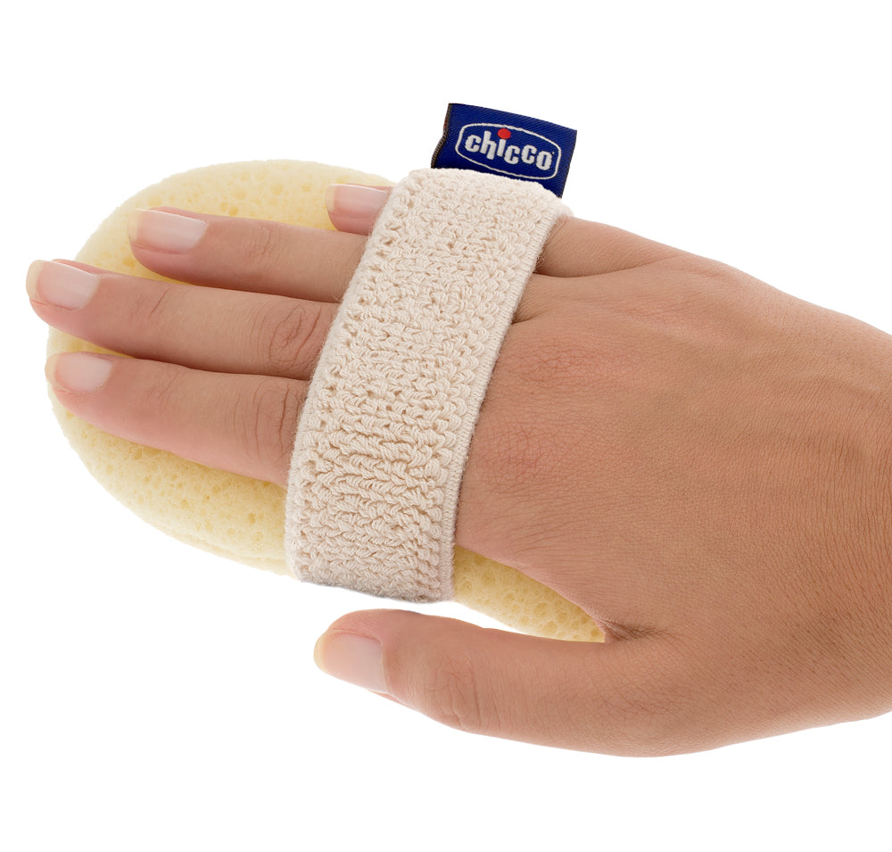 - se potriveste perfect pe configuratia mainii datorita elasticului situat pe una dintre fetele buretelui, lasand cealalta mana libera pentru sustinerea bebelusului.