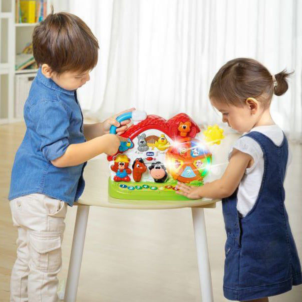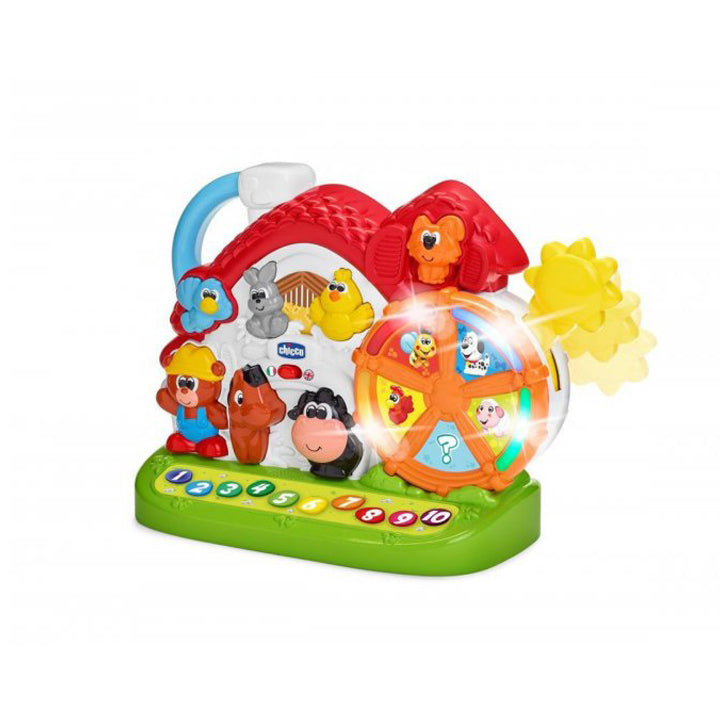 Centru de activitati portabil care trateaza cu succes unul dintre cele mai populare subiecte din lumea copiilor- animalele de la fermă. Ascultand cele 50 cuvinte, fraze, sunete si cantece, copilul se familiarizeaza cu muzicalitatea celor doua limbi in care se poate folosi jucaria: italiana/engleza si invata folosind cele 3 nivele evolutive ale jocului, accesand ursuletul care este selectorul de joc.