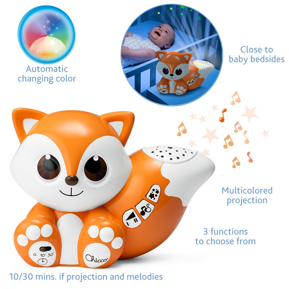 Aceasta jucarie portabila tip proiector in forma de vulpita personalizeaza atmosfera camerei bebelusului, insotindu-l in timpul ciclurilor de somn cu: