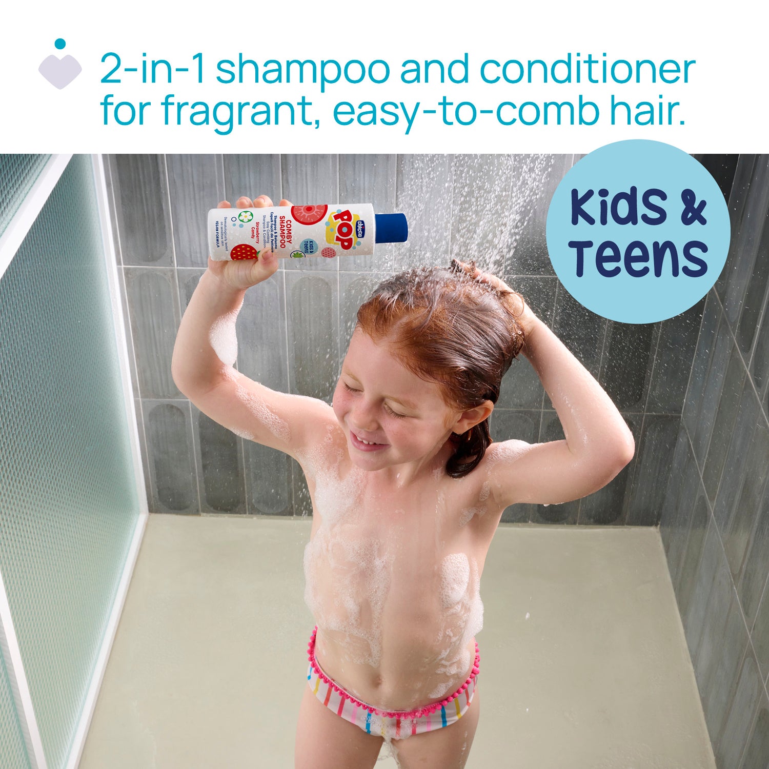 Sampon si balsam de par 2 in 1 Chicco POP cu aromă de bomboane cu capsuni, formulă vegană, pentru copii și adolescenți 250 ml
