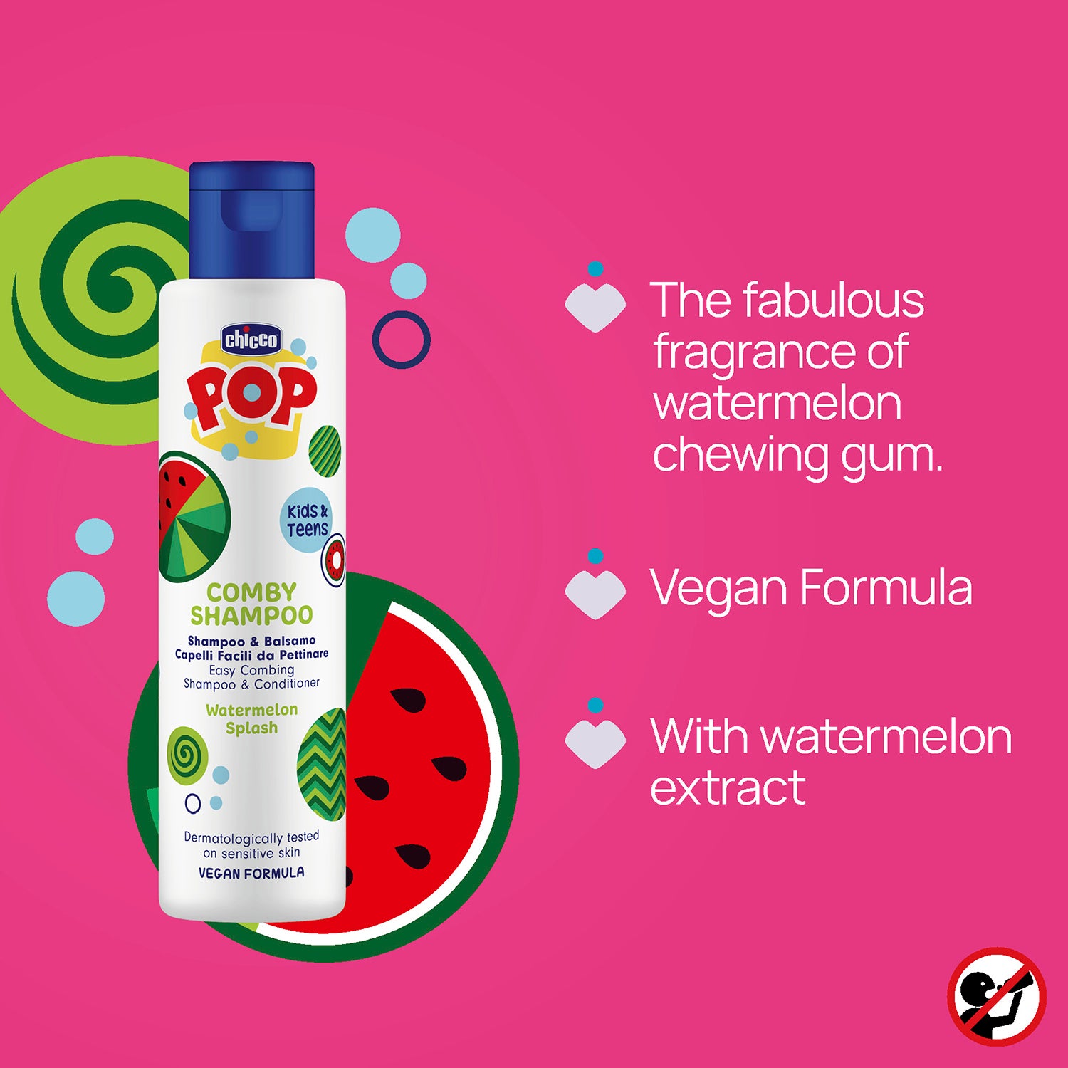 Sampon si balsam de par 2 in 1 Chicco POP cu aroma de pepene rosu, formula vegana, pentru copii si adolescenti, 250 ml
