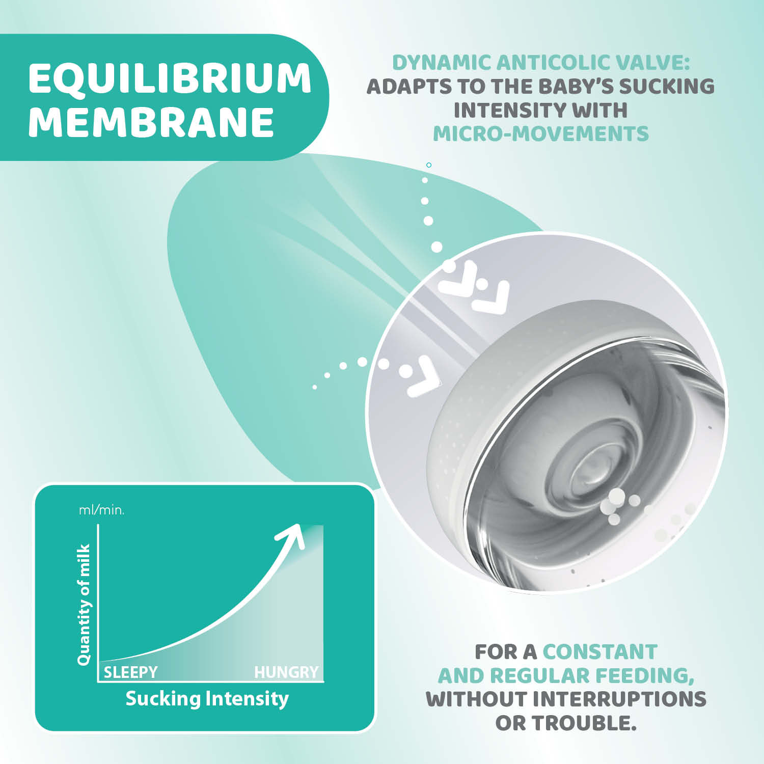 Este un produs revolutionar care lupta impotrica colicilor datorita combinatiei dintre tetina Physio si membrana inovatoare Equilibrium; ele sustin ritmul si intensitatea fiziologica a bebelusului, ajutand la prevenirea ingerarii aerului.