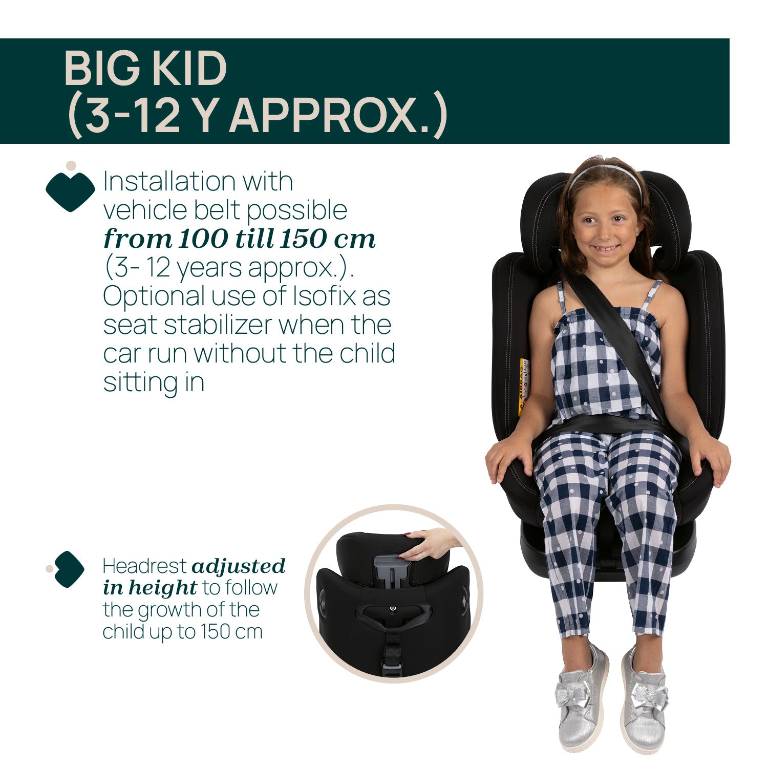 Acest scaun auto pentru o utilizare indelungata este conceput pentru a insoti copilul de la nastere pana la aproximativ 12 ani, conform standardului ECE R129/03, care acopera o gama de inaltimi de la 40 pana la 150 cm. Acesta este dotat cu un sistem de rotatie de 360°, ceea ce permite asezarea rapida si usoara a copiluluiin scaun.