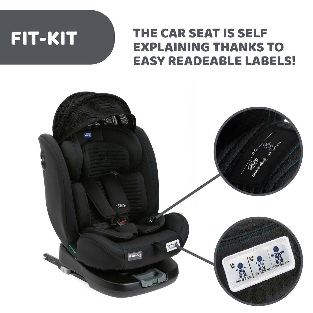 Chicco Unico EVO i-Size este un scaun auto copii conceput pentru a însoți copilul de la naștere și până la aproximativ 12 ani, conform standardului ECE R129/03, standard ce acoperă înălțimi de la 40 până la 150 cm. Unico Evo este dotat cu un sistem de rotație la 360°, ceea ce permite așezarea rapidă și ușoară a copilului în scaun.