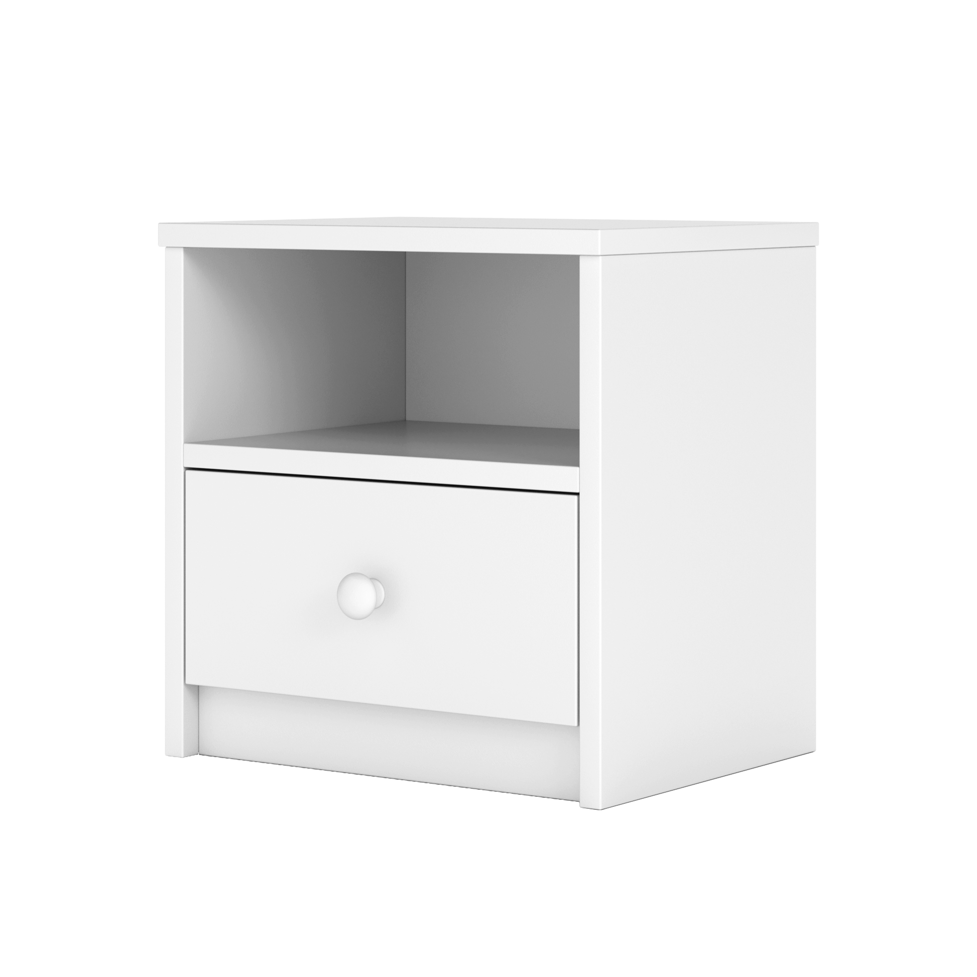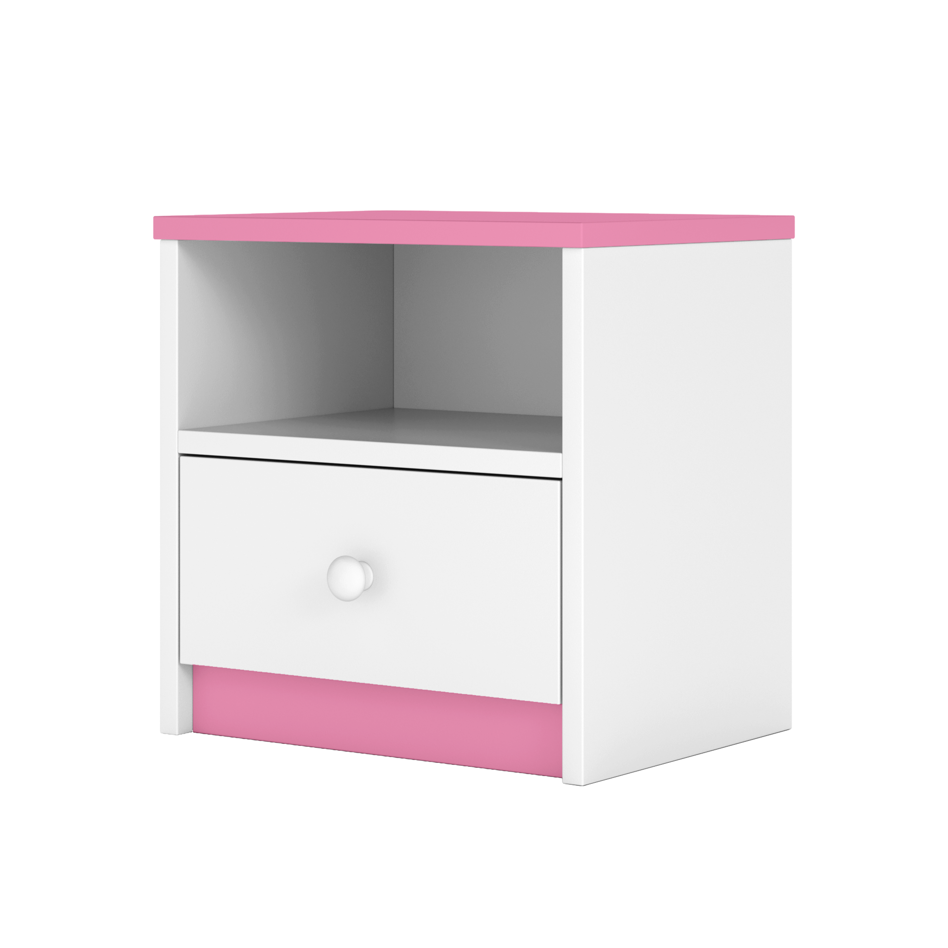 Are un sertar spațios pentru obiecte personale și un raft deschis foarte practic, ideal pentru cărți, jucării sau accesorii pe care copilul le folosește zilnic. Designul simplu și liniile curate o fac ușor de integrat în orice decor.
