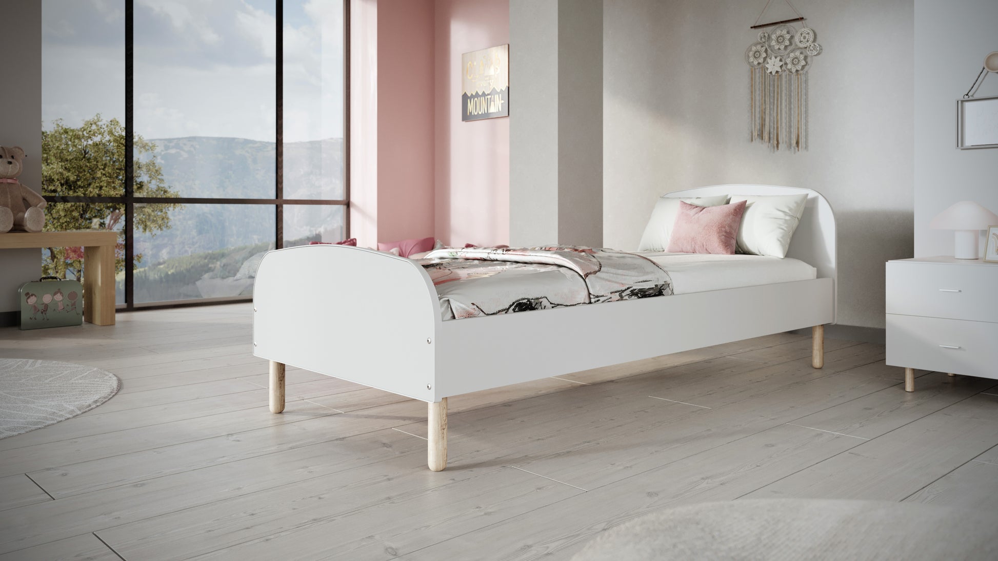 Patul Emma 180x90 cu saltea este alegerea perfectă pentru copiii care au nevoie de un pat confortabil, stabil și sigur, ideal pentru trecerea către un pat de junior. Designul său modern, cu margini rotunjite și tăblie arcuită, oferă un aspect plăcut și prietenos în orice cameră. Picioarele din lemn masiv adaugă stabilitate, iar structura patului este realizată din materiale rezistente, ușor de întreținut.