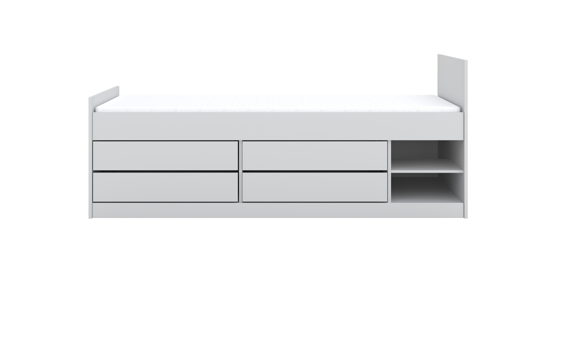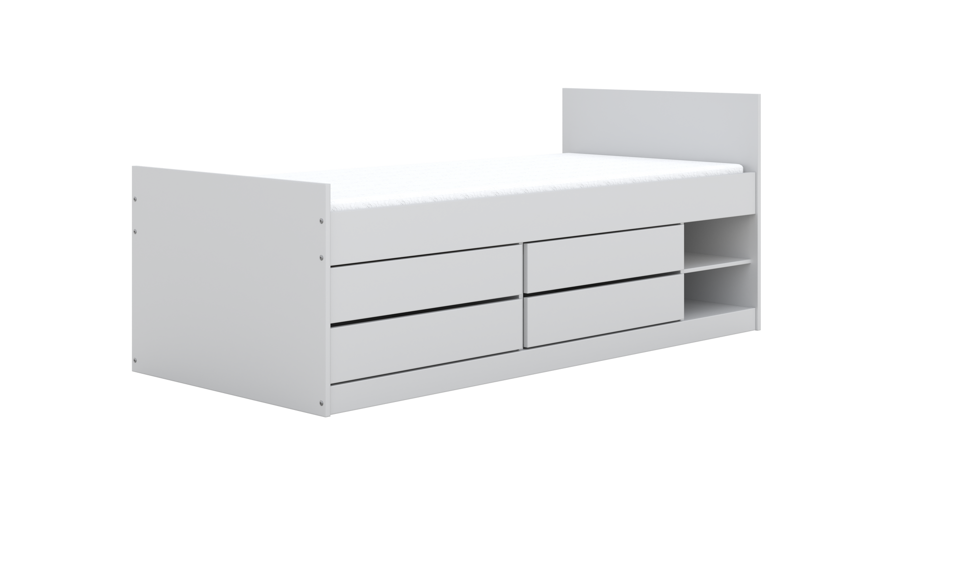Elementul care diferențiază patul Leon este sistemul său amplu de depozitare integrat sub saltea. Patru sertare spațioase, montate pe glisiere metalice cu bile de 600 mm, asigură deschidere lină și acces rapid la haine, jucării, lenjerii sau alte obiecte folosite zilnic. Pe partea laterală, două rafturi deschise oferă un loc perfect pentru cărți, cutii sau lucruri pe care copilul vrea să le aibă mereu la îndemână.