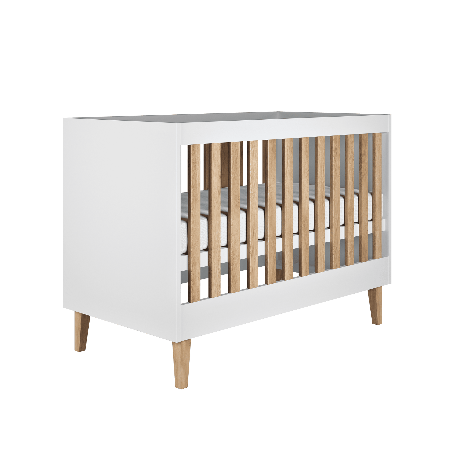 Patul pentru bebeluși KUBI este creat pentru părinții care caută siguranță, confort și un design minimalist ce se potrivește ușor în orice cameră de copil. Cu linii curate și combinația elegantă dintre lemnul natural și panourile mate, acest pat devine rapid piesa centrală a unei camere moderne.