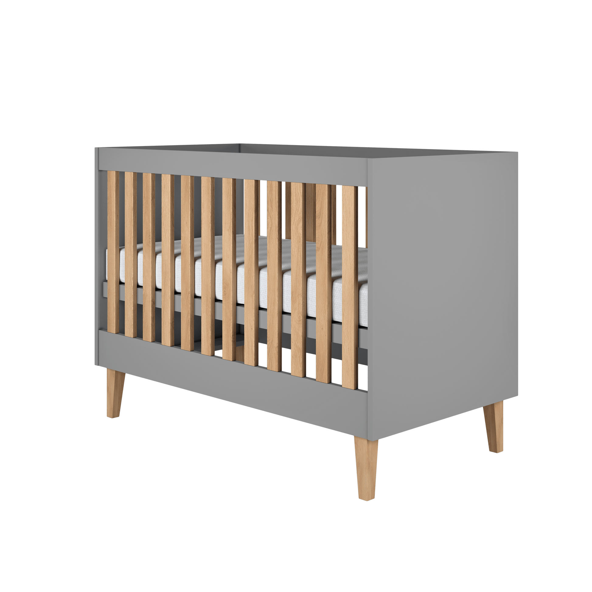 Este construit din panouri rezistente de 18 mm, cu un conținut redus de formaldehidă, pentru un mediu cât mai sigur pentru cei mici. Picioarele sunt realizate din lemn masiv de stejar, atent finisat cu lac incolor, astfel încât patul să rămână stabil și frumos în timp. Barele din lemn oferă vizibilitate bună asupra copilului, iar salteaua așezată pe o suprafață de 120 × 60 cm asigură locul ideal pentru somn liniștit.